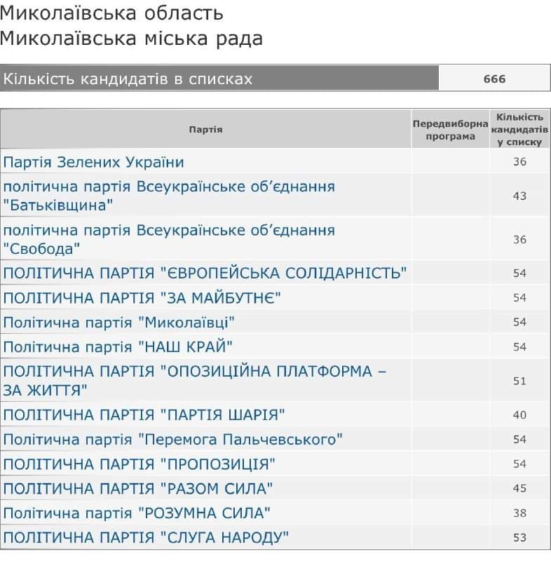 Также занять кресла депутатов Николаевского городского совета хотят кандидаты от «Партии зеленых Украины» во главе с Екатериной Тыновой, «Вместе сила» с Сергеем Маленко и «Умная сила» с Владимиром Манченко. Всего вд 14 партий баллотируется «дьявольское» количество кандидатов в депутаты — 666 человек.