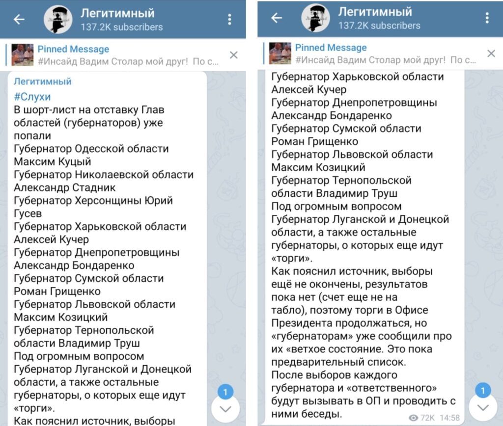 Недавно на инсайдерском телеграмм канале «Легитимный» был обнародован список председателей областных государственных администраций, которые находятся в зоне риска и на грани увольнения из-за провальных результатов местных выборов. Список предварительный, ведь после объявления официальных результатов волеизъявления, всех претендентов на вылет будут вызывать на разговор в Офис Президента, там и решится их судьба.