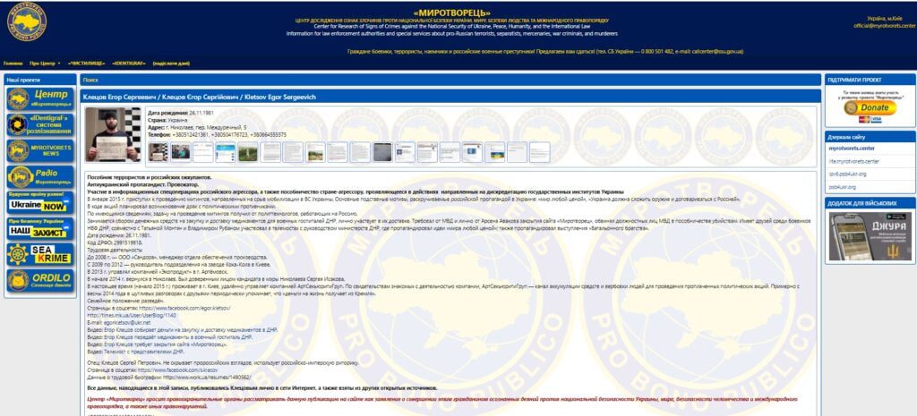 Фамилия Егора Клецова была внесена в базу «Миротворец» в конце января 2015 года. Авторы проекта обвиняют его в пособничестве терроризму и российских оккупантов.