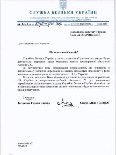 После отказа баллотироваться в депутаты Николаевского городского совета история Егора Клецова не закончилась. Народный депутат Украины Соломия Бобровская направила официальное обращение в Службу безопасности Украины, чтобы там проверили деятельность николаевца на признаки государственной измены. В официальном ответе заместителя председателя СБУ Сергея Андрущенко указано следующее: