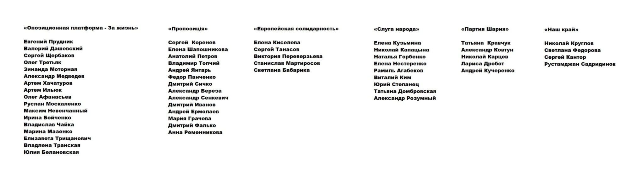 У підсумку новий склад депутатського корпусу сформують: 17 представників “Опозиційної платформи – За життя”, 14 депутатів від партії “Пропозиція”, 9 депутатів від “Слуги народу”, по 5 депутатів від “Європейської Солідарності” та “Партії Шарія”, 4 депутати від партії “Наш Край”.