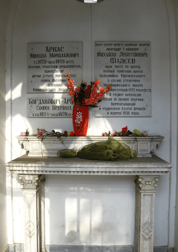 У 1936 році представники НКВС осквернили склеп великого громадянина Миколаєва. Особи, які не були здатні дати цьому світові нічого, крім руйнування, репресій та смерті, в документах з презирством називали Михайла Фалєєва «царським сатрапом». Після відкриття могили першого градобудівника злодії при офіційних посадах викрали його численні нагороди, знищили офіцерські атрибути, а місце останнього упокою зрівняли з землею. Гроб перепоховали у родинному склепі Аркасів.