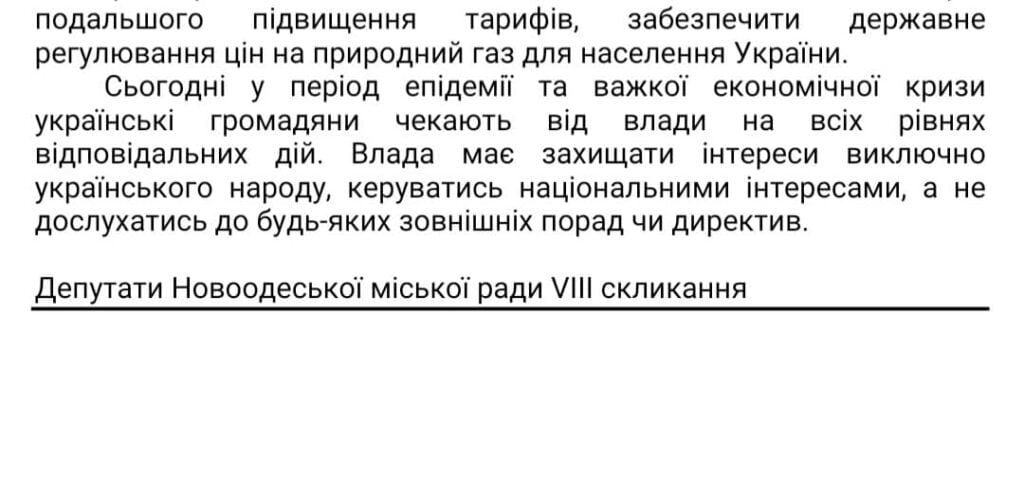 Минулого четверга, 21 січня, в ході сесії Новоодеська міська рада підтримала проект звернення до керівництва країни, зокрема Президента Володимира Зеленського, Верховної Ради та Кабінету Міністрів. В ньому депутати висловили заклик переглянути рішення, які призвели до подорожчання комунальних послуг: на електричну енергію та газ. Ірина Пономарьова повідомила, що нині ухвалений проект звернення чекає на підпис від Новоодеського міського голови.