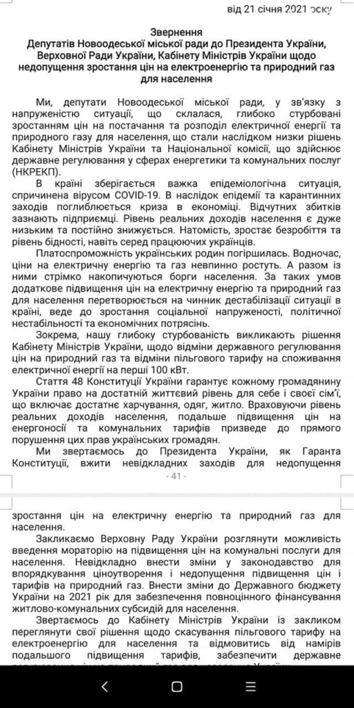 У відповідному зверненні зазначається, що відміна пільгового тарифу на споживання перших 100 кВт енергії та збільшення вартості комунальних послуг, зважаючи на зниження платоспроможності населення, провокує ще більше накопичення боргів у користувачів, особливо у період важкої епідеміологічної ситуації з COVID-19. Єдиним виходом із цієї ситуації є недопущення збільшення цін і тарифів у 2021 році, а також внесення змін до державного бюджету, щодо повноцінного фінансування субсидій для населення.