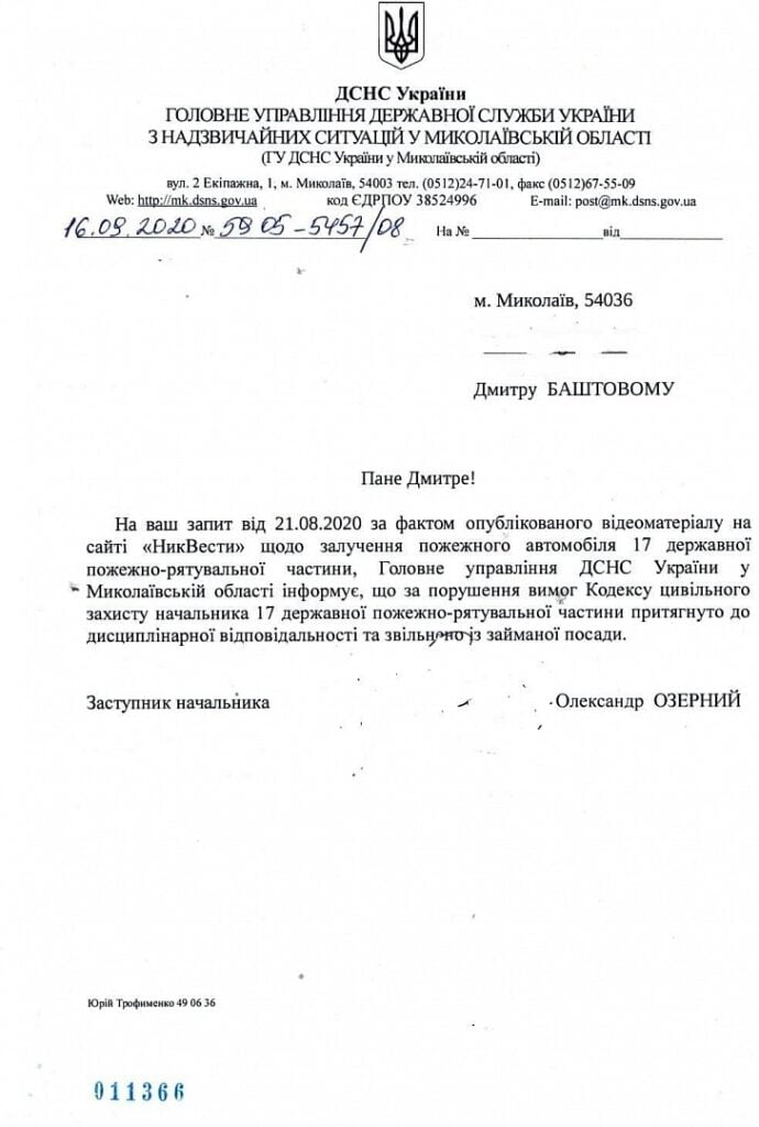 Регіональний координатор ГО “Опора” Дмитро Баштовий отримав офіційну відповідь від заступника начальника ГУ ДСНС Миколаївської області Олександра Озерного, в якій зазначено, що після зазначеного інциденту начальника 17-ї державної пожежно-рятувальної частини було притягнуто до дисциплінарної відповідальності. Його звільнили з посади за порушення Кодексу цивільного захисту. Це і не дивно, адже працівники, яким було доручено виконання робіт, втягнули рятувальників у політичний процес, хоча вони мають зберігати нейтралітет. Про деталі службового розслідування, хто замовив виконання робіт та чому начальник на це погодився, не повідомляється.