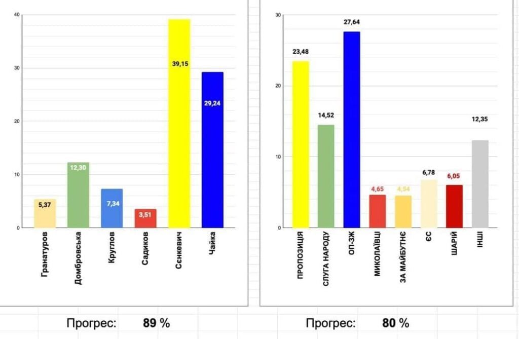 Шанси набрати бодай 5% голосів виборців все ще мають політична партія “Миколаївці” на чолі з Ігорем Дятловим, а також “За майбутнє”, до її лав у серпні місяці приєднався колишній міський голова Юрій Гранатуров. Партія “Наш Край”, від якої балотується колишній губернатор області часів Януковича Микола Круглов, пок не проходить 5% бар’єр. Так само не мають жодних шансів на перемогу у мерських виборах Микола Круглов, Юрій Гранатуров та Олександр Садиков.