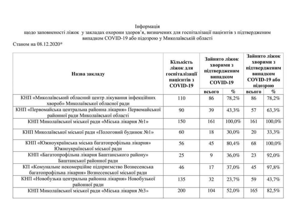 Варто зауважити, що нині у Миколаєві повністю зайняті всі ліжка пацієнтами з підтвердженим діагнозом та підозрою на коронавірус у міській лікарні №1, Обласний центр лікування інфекційних захворювань заповнено на 78,2%. У міській лікарні №5 зайнято лише 40% ліжок для підтверджених хворих.