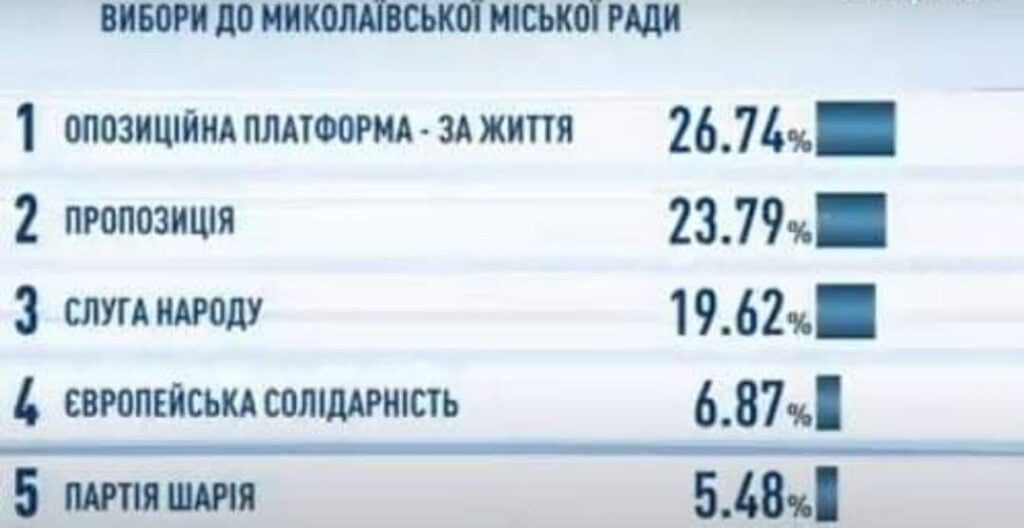 Якщо на виборах мера, миколаївці віддали найбільшу кількість голосів чинному міському голові від партії “Пропозиція”, то на виборах депутатів партія програла першість. Нині найбільшу підтримку городяни висловили “Опозиційній платформі – За життя” – 28,08 % голосів. За “Пропозицію” проголосувало 22,88%, за “Слуг народу” – 14,9%. Також 5% бар’єр подолали “Європейська Солідарність” – 6,78% та “Партія Шарія”- 6,08%. Під питанням все ще проходження до міської ради партії “Миколаївці” на чолі з Ігорем Дятловим”, “За майбутнє” – Юрій Гранатуров, а також “Наш край” з Миколою Кругловим.